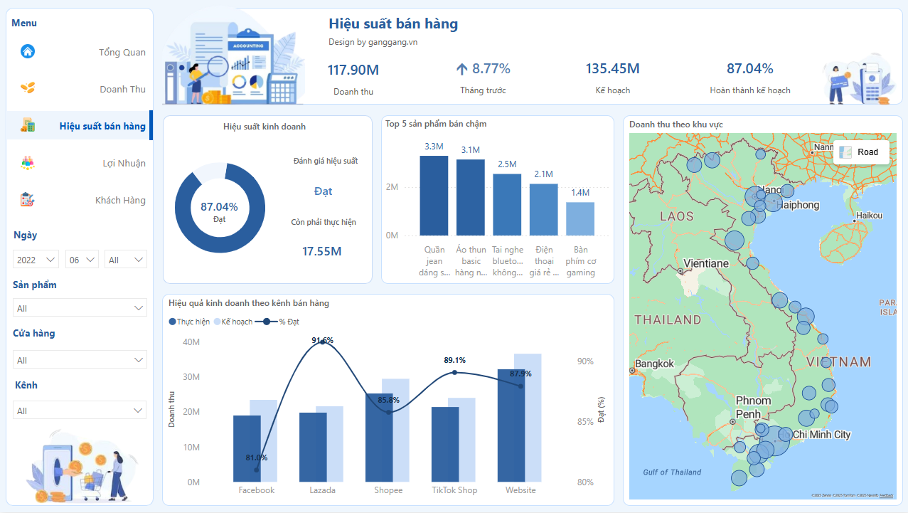 Mục đích: Đánh giá mức độ thực thi kế hoạch kinh doanh thông qua so sánh giữa doanh thu thực tế và mục tiêu theo từng kênh, khu vực và sản phẩm.