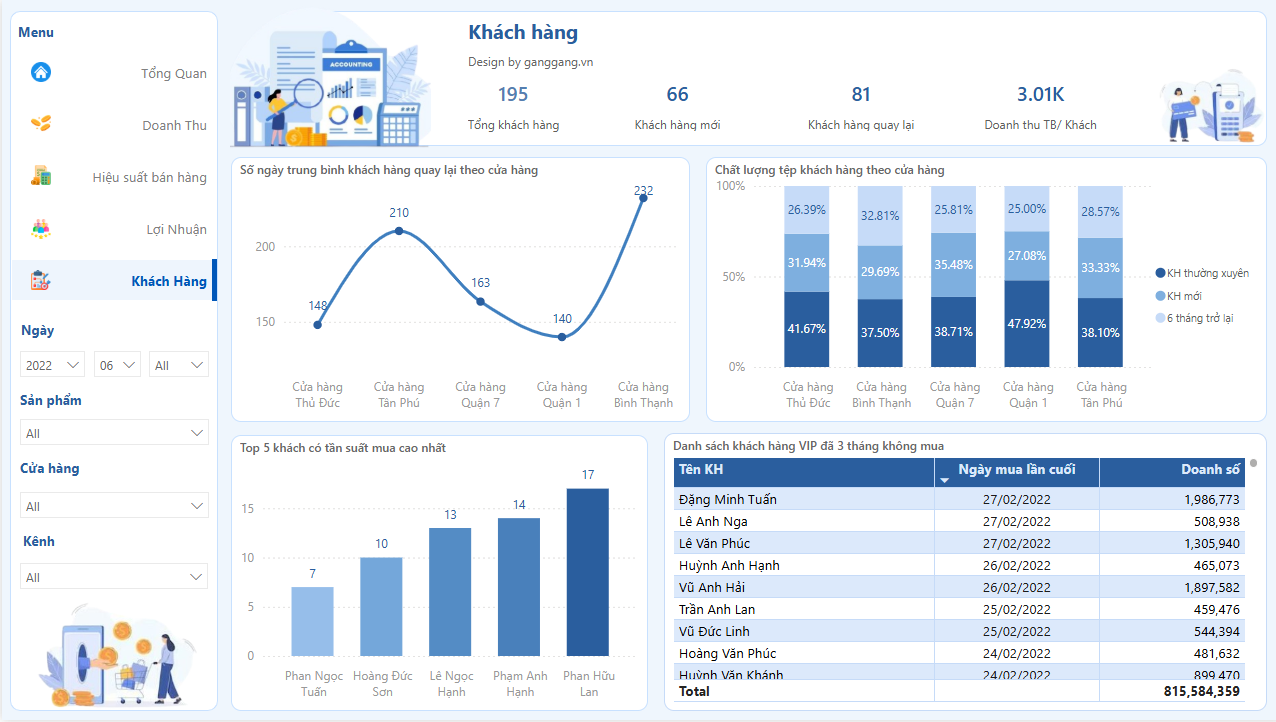 Các biểu đồ trong Dashboard bán hàng được thiết kế theo chuỗi logic hành vi, kết nối từ khả năng giữ chân, tần suất quay lại cho đến giá trị khai thác trên từng nhóm khách. Cách tiếp cận này không chỉ cho thấy bao nhiêu khách đã rời đi, mà còn làm rõ những khách đó mang lại bao nhiêu giá trị và tác động của họ đến tính bền vững của doanh thu. Nhờ vậy, doanh nghiệp có thể đánh giá chính xác liệu tăng trưởng hiện tại đang dựa trên khách hàng trung thành hay chỉ phụ thuộc vào việc liên tục thu hút khách mới.