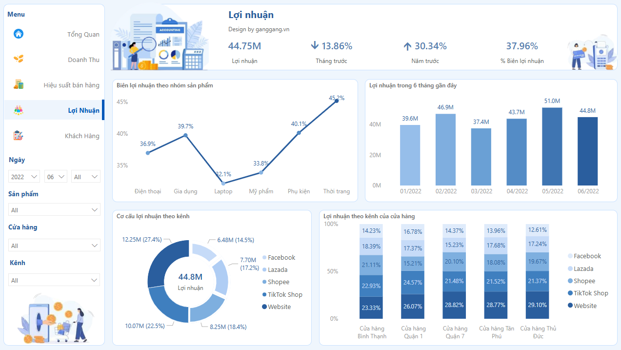Nội dung chính: tập trung phân tích hiệu quả tạo doanh thu trên nhiều chiều trọng yếu gồm sản phẩm, nhóm ngành, kênh bán và từng cửa hàng. Thay vì chỉ phản ánh kết quả bán hàng thuần túy, cách tiếp cận này giúp làm rõ chất lượng và cấu trúc của nguồn thu, trả lời được câu hỏi doanh thu đến từ đâu và dựa vào những trụ cột nào.