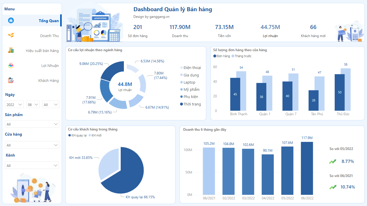 Thông qua các góc nhìn từ tổng quan đến chi tiết theo doanh thu, hiệu suất bán hàng, khách hàng và lợi nhuận, Dashboard bán hàng không chỉ phản ánh kết quả đạt được mà còn làm rõ chất lượng tăng trưởng và các yếu tố tác động chính đến hoạt động kinh doanh.