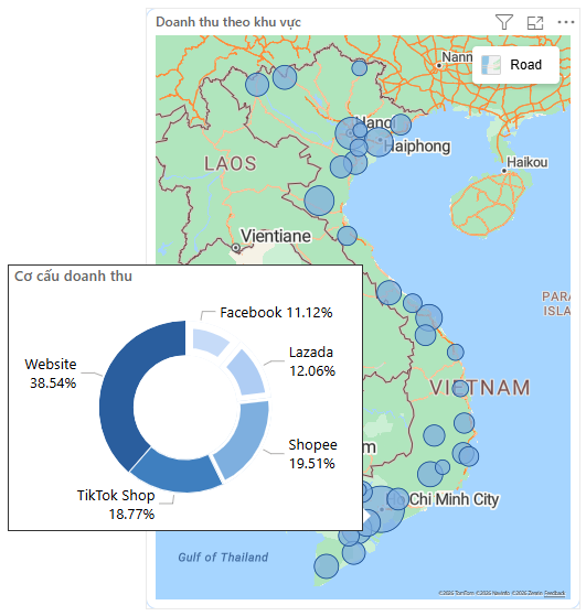 Dashboard bán hàng này có sự kết hợp giữa cấu trúc doanh thu theo khu vực và kênh bán, giúp nhà quản lý nhìn rõ doanh thu đến từ đâu và được tạo raqua kênh nào. Bản đồ này trong Dashboard bán hàng cho thấy mức độ đóng góp của từng khu vực, qua đó đánh giá sự tập trung hay phân tán doanh thu trên toàn thị trường.