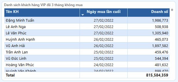 Tổng thể, Dashboard này đóng vai trò như một công cụ định hướng chiến lược khách hàng, hỗ trợ nhà quản lý ra quyết định về việc ưu tiên nguồn lực cho giữ chân, tái kích hoạt hay mở rộng tệp khách mới. Cách tiếp cận này giúp doanh nghiệp tối ưu hóa doanh thu dài hạn và nâng cao giá trị vòng đời khách hàng, thay vì chỉ tập trung vào tăng trưởng bán hàng ngắn hạn.