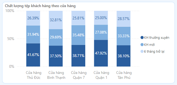 Biểu đồ thể hiện cấu trúc chất lượng tệp khách hàng trong Dashboard bán hàng theo từng cửa hàng, phản ánh cách mỗi điểm bán đang tạo và duy trì nguồn doanh thu. Việc phân tách theo mức độ gắn bó giúp đánh giá tính bền vững của tăng trưởng, thay vì chỉ nhìn vào kết quả bán hàng ngắn hạn.