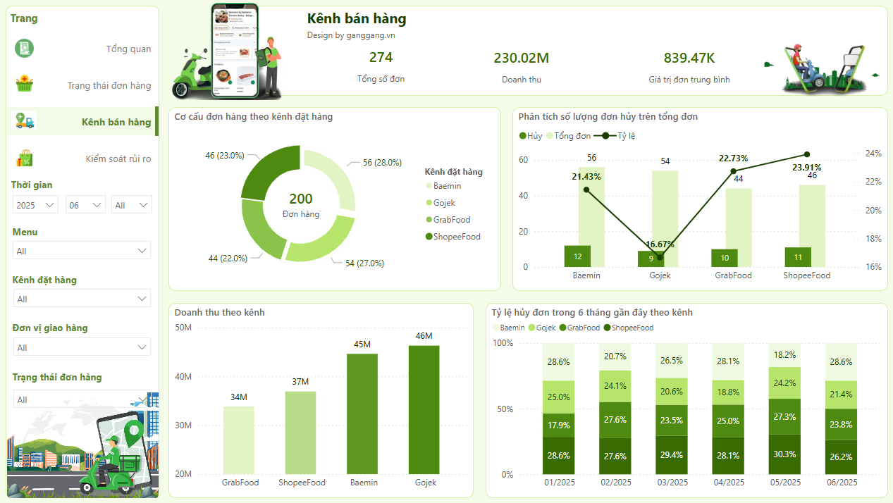 Thông qua việc phân tích cơ cấu đơn, xu hướng doanh thu và tỷ lệ hủy theo từng kênh, dashboard giúp phát hiện những vấn đề tiềm ẩn mà việc theo dõi thủ công rất dễ bỏ sót. Chẳng hạn: