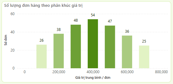 Điểm nhấn của trang là biểu đồ phân tích số lượng đơn hàng theo phân khúc giá trị. Biểu đồ này giúp làm rõ cấu trúc chi tiêu của khách hàng, mức độ đóng góp của từng nhóm đơn vào tổng doanh thu và mức độ phụ thuộc của doanh nghiệp vào các phân khúc nhất định.