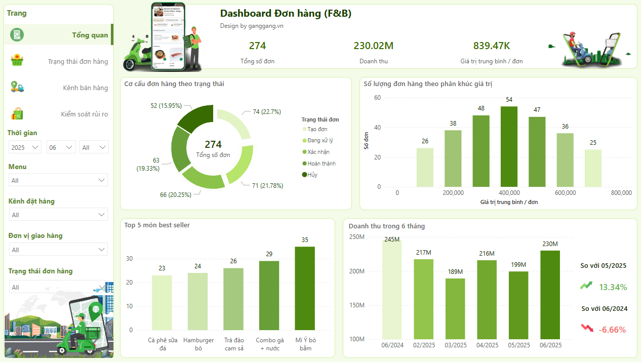 Tổng thể, hệ thống dashboard phân tích đơn hàng F&B không chỉ phản ánh kết quả kinh doanh, mà còn làm rõ chất lượng vận hành và mức độ ổn định của toàn bộ quy trình xử lý đơn hàng. Sự kết hợp hài hòa giữa góc nhìn tổng quan và phân tích chi tiết theo từng khía cạnh giúp doanh nghiệp: