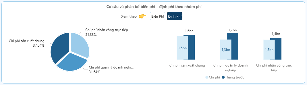 Bằng cách phân tích chi phí theo nhóm và theo tính chất, Dashboard Quản trị phí giúp người dùng hiểu rõ đâu là phần chi phí mang tính ổn định, đâu là phần biến động theo hoạt động.