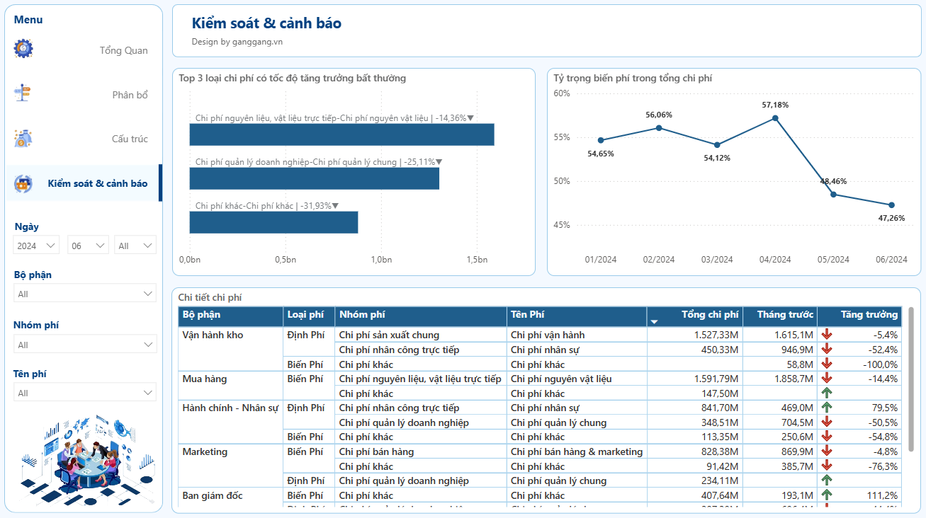 Trang kiểm soát & cảnh bảo của Dashboard Quản trị phí tập trung làm nổi bật các dấu hiệu bất thường và xu hướng lệch chuẩn, giúp nhà quản trị không bỏ lỡ các rủi ro tiềm ẩn.