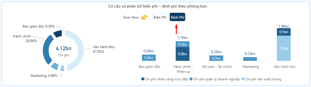 Trong cùng một khung nhìn, người xem vừa nắm được phòng ban nào là trọng tâm chi phí, vừa hiểu được chi phí đó đến từ những cấu phần nào. Từ đó, giúp việc đọc và ra quyết định trở nên nhanh chóng mà không cần phân tích sâu hay đối chiếu nhiều biểu đồ khác nhau.