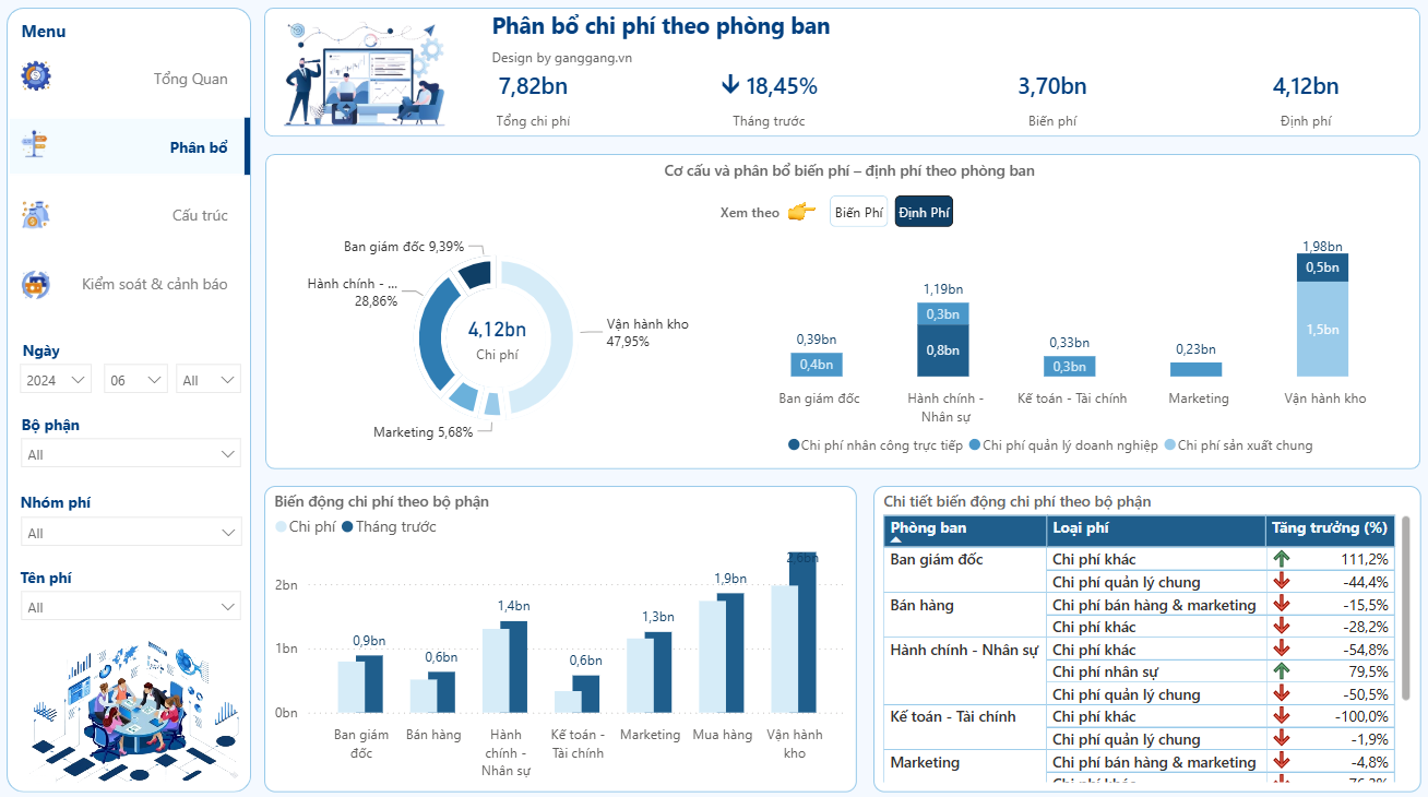 Trang Cấu trúc và biến động chi phí của Dashboard Quản trị phí đóng vai trò phân tích chiều sâu, giúp lý giải nguyên nhân đằng sau các điểm tiêu hao đã được nhận diện.