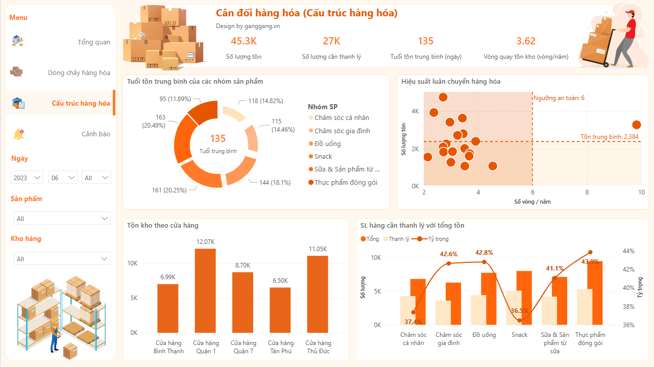 Bắt đầu từ việc xác định quy mô tồn kho, theo dõi dòng chảy nhập – xuất và tuổi tồn, dashboard tiếp tục hỗ trợ đánh giá hiệu suất luân chuyển, vòng quay cũng như chất lượng hàng tồn. Đồng thời, các cơ chế cảnh báo sớm giúp nhận diện rủi ro cần hành động kịp thời.