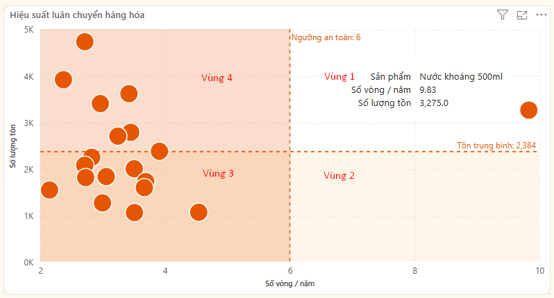 - Vùng vòng quay cao (Vùng 1 + 2): kể cả khi tồn kho ở mức cao, phản ánh những nhóm sản phẩm có khả năng luân chuyển tốt. Với các nhóm này, tồn kho không phải là gánh nặng mà đang đóng vai trò đảm bảo doanh thu và tính liên tục của hoạt động bán hàng. Đây chính là phần tồn kho đang tạo giá trị và có thể được duy trì hoặc tối ưu tăng thêm trong phạm vi kiểm soát.