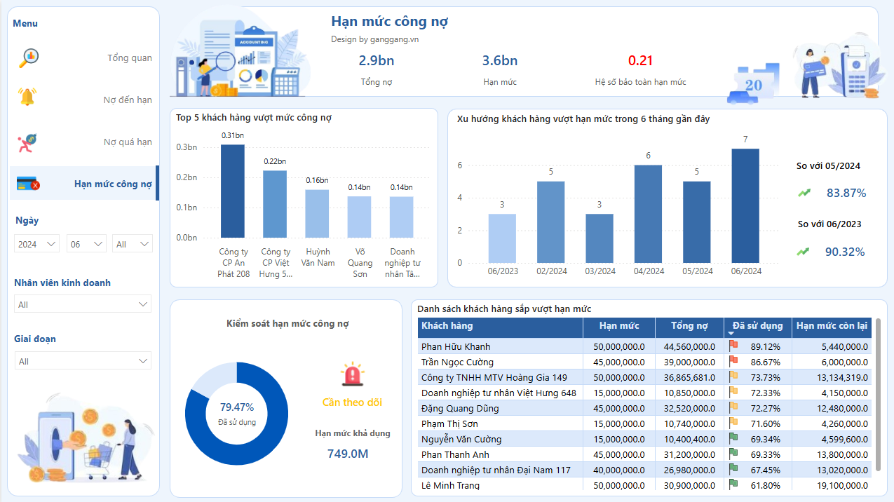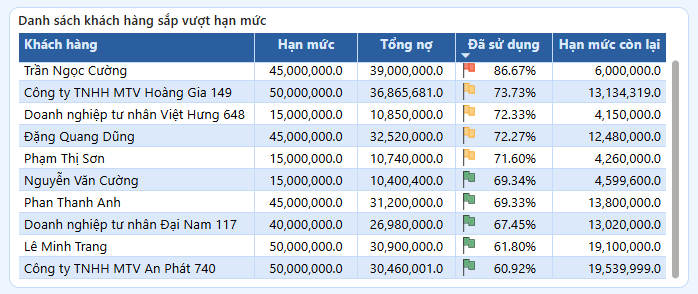 Nội dung phân tích: Giám sát việc sử dụng hạn mức công nợ của khách hàng nhằm kiểm soát rủi ro tín dụng.