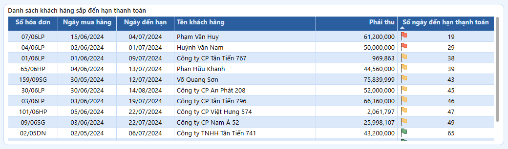 Danh sách cảnh báo các khách hàng có các khoản phải thu đang tiến gần thời điểm đến hạn thanh toán, giúp người quản lý chủ động kiểm soát dòng tiền và hạn chế rủi ro quá hạn. Dựa vào cột Số ngày đến hạn thanh toán, có thể phân nhóm rõ ràng các khoản nợ từ sắp đến hạn (khoảng 0–30 ngày) đến trung hạn (30–60 ngày) và xa hơn (trên 60 ngày).